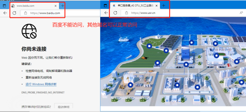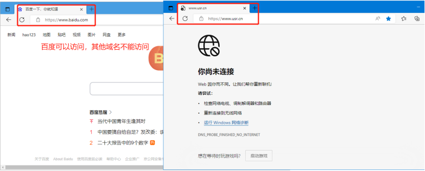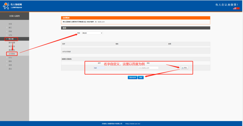 <2>連接路由器的設備將除設置的域名可以訪問外,其余域名都無法訪問設置。注:若選擇白名單,而未添加規則,默認白名單為空,即所有域名都不能夠訪問