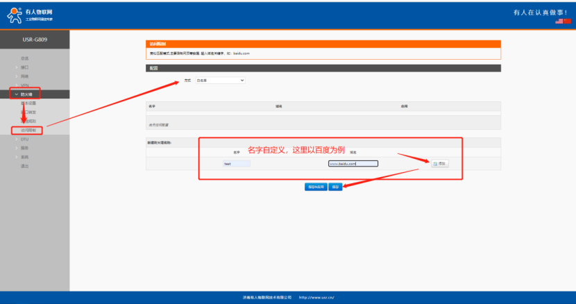 <1>方式選擇白名單,新建防火墻規則中名字可自擬,域名即為要放行的正確域名,點擊添加,然后點擊報保存,規則立即生效。