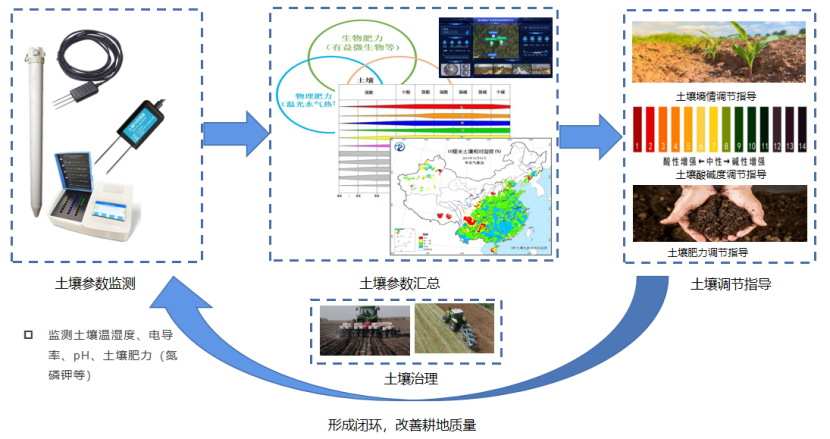通過對土壤溫濕度、電導率、pH、肥力等數據的監測,數據匯總,提供針對性土壤治理措施,治理過沙或過黏土壤、鹽堿土壤和酸化土壤,提高耕地質量水平。