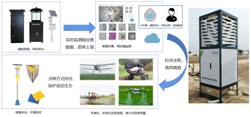 通過蟲情測報燈、智能孢子捕捉儀等智能儀器實時監測病蟲害情況,實時上報高清圖片,平臺通過AI圖像識別進行實時判斷,預測病蟲害發生情況,及時提醒,科學指導農藥配撒,減少損失;
