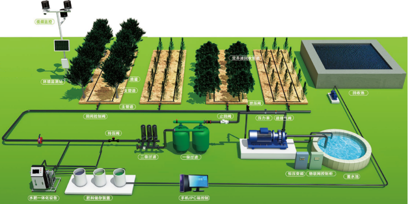 水肥一體機系統主要由給水系統、施肥機、監控系統、回水池、補水系統和殺菌消毒裝置等組成