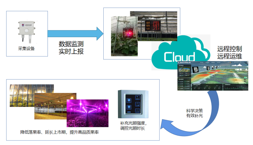 通過大棚內光照傳感器或光合有效輻射傳感器檢測大棚內光照情況,當白天時段檢測到光照強度過小時,系統自動打開補光燈,保證作物生長過程中光照需求。