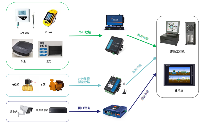 v 若現(xiàn)場終端設(shè)備為串口設(shè)備,可以通過串口服務(wù)器或wifi串口服務(wù)器將數(shù)據(jù)傳輸至現(xiàn)場本地工控機(jī)或觸摸屏顯示。此時(shí)要確認(rèn)現(xiàn)場是否方便布線,若方便布線可選用串口服務(wù)器,若現(xiàn)場有wifi覆蓋可選用wifi串口服務(wù)器;
