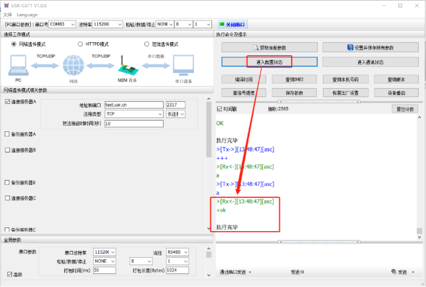 打開串口后,先點擊進入配置狀態,如果模塊能返回+ok的字符,說明電腦和模塊連接是沒有問題的;點擊”獲取當前參數”,可以看到DR771出廠默認的參數。