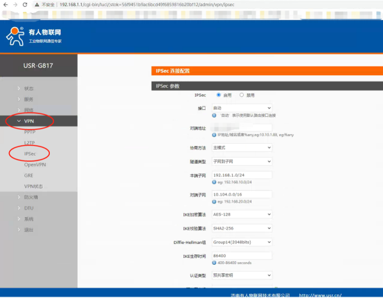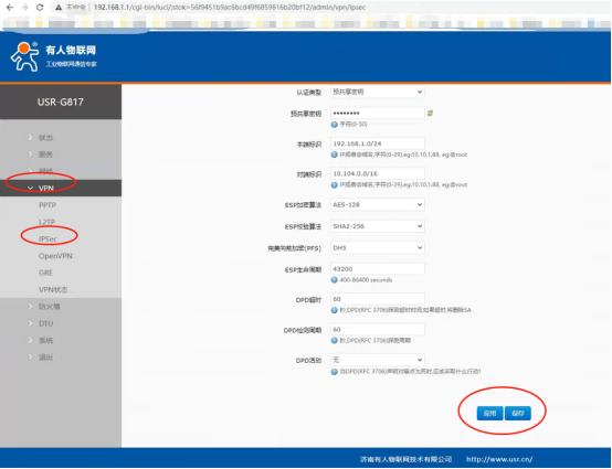 注意:飛塔服務(wù)器的對(duì)端標(biāo)識(shí)必須設(shè)置為IP,服務(wù)器和路由器設(shè)置一致即可,客戶(hù)端(即USR-G817)的對(duì)端標(biāo)識(shí)可以不寫(xiě)。