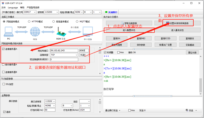 2)點擊進入配置狀態,將勾選連接服務器A,將服務器的IP和端口填入。之后點擊保存并設置所有參數