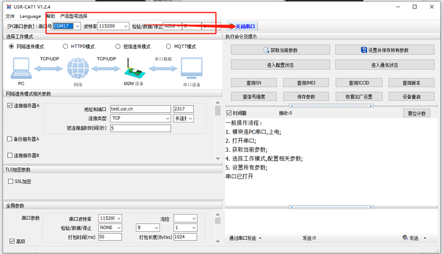 3、設備設置成功之后可以看到服務器上有了一個連接對象,并且設備的串口與服務器可以雙向互發數據