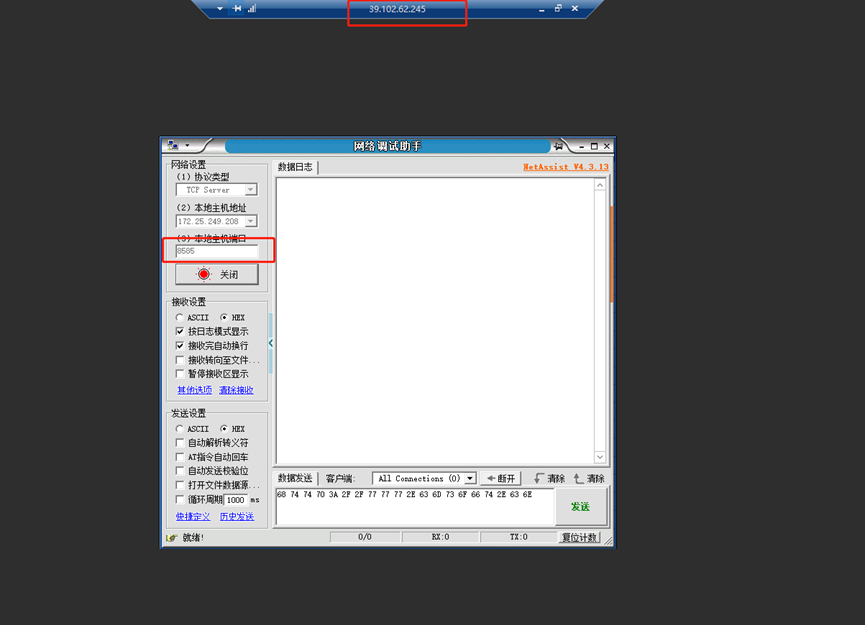 1、搭建好TCP服務器,或租賃一個TCP服務器(此處測試我們以租賃的服務器為例,在服務器上打開一個網絡助手來模擬TCP server)