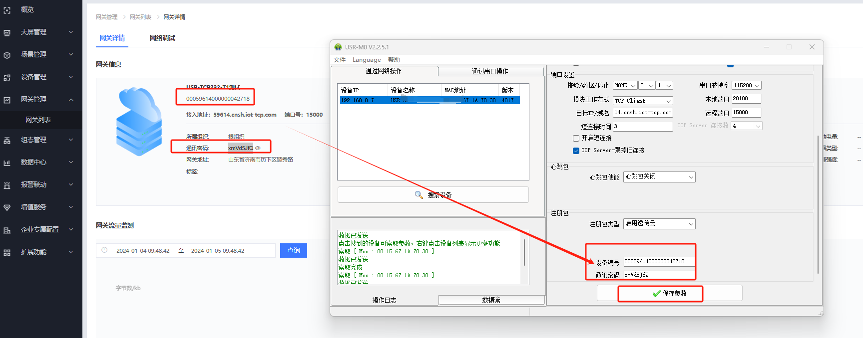 2)工作方式選擇TCP Client,目標ip: 59614.cnsh.iot-tcp.com,遠程端口號:15000,注冊包選用啟用透傳云,設備編號和通訊密碼可以在有人云平臺設備列表中的查看中可以查看到。設置完成后點擊保存參數。