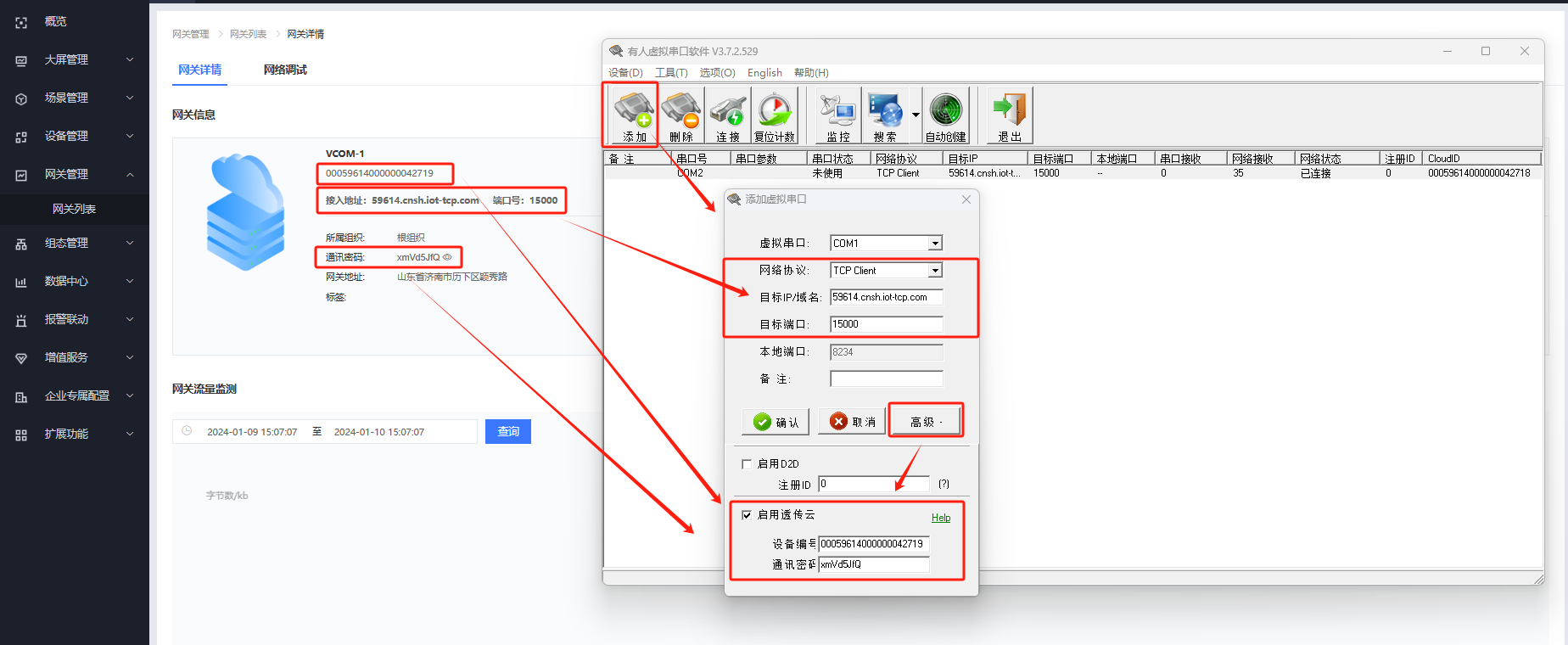 有人云--網關管理--網關列表--添加:VCOM-1,根組織,“SN不支持,點這里”,開啟有人云透傳,點擊保存即可