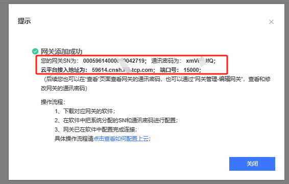 設備名稱可自定義,所屬組織選擇根組織,T1目前不支持SN碼添加,點擊右側“沒有SN,點這里”,設備ID和通訊密碼可以自動生成,設備ID20位,通訊密碼必須是8位(支持修改密碼),開啟有人云透傳。設置完成后點擊保存即可看到平臺給分配的接入地址和SN 密碼等信息。