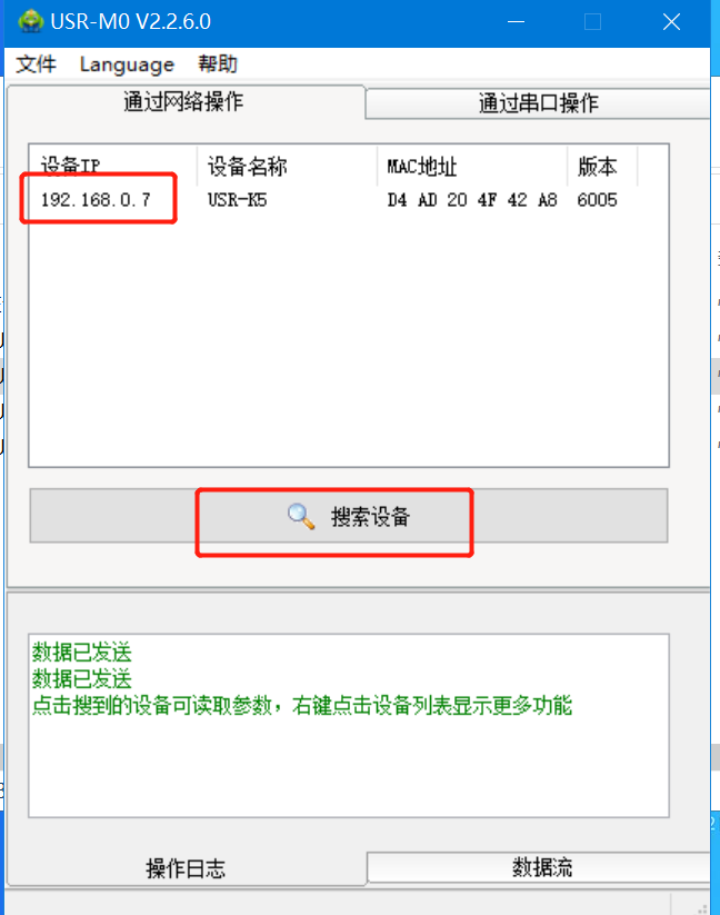 1、K5模塊和電腦通過網線直連,打開M0設置軟件,點擊“搜索”,可以搜到K5,此時是192.168.0.7的靜態IP。