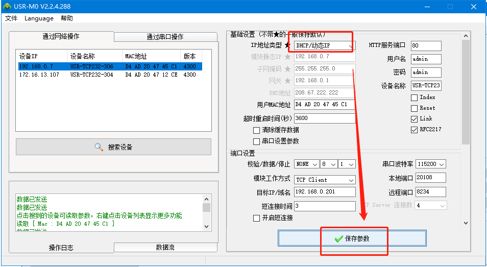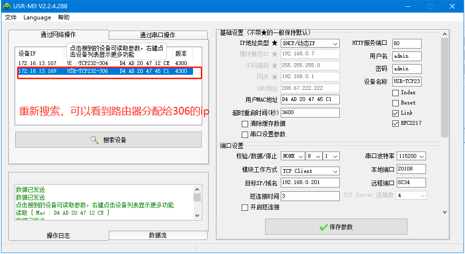306和電腦都接到同一個(gè)路由器上,用M0軟件搜索到306,出廠默認(rèn)ip是192.168.0.7,雙擊顯示右邊參數(shù),ip選擇動(dòng)態(tài)獲取,保存參數(shù),重新搜索,可以看到路由器分配給給306的ip。