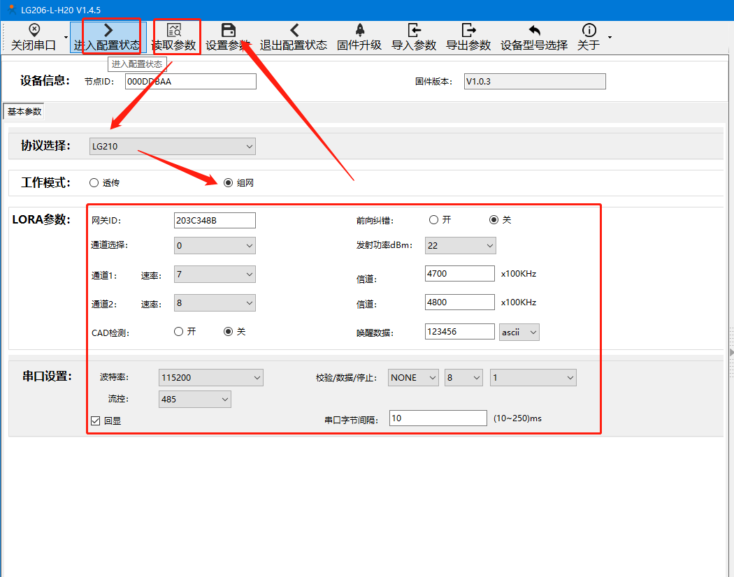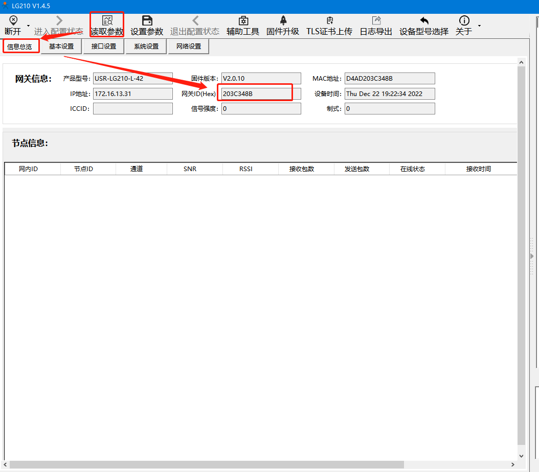3、點擊“讀取參數”,在信息總覽中復制保存網關ID,之后配置LORA節點LG206組網時用的到。