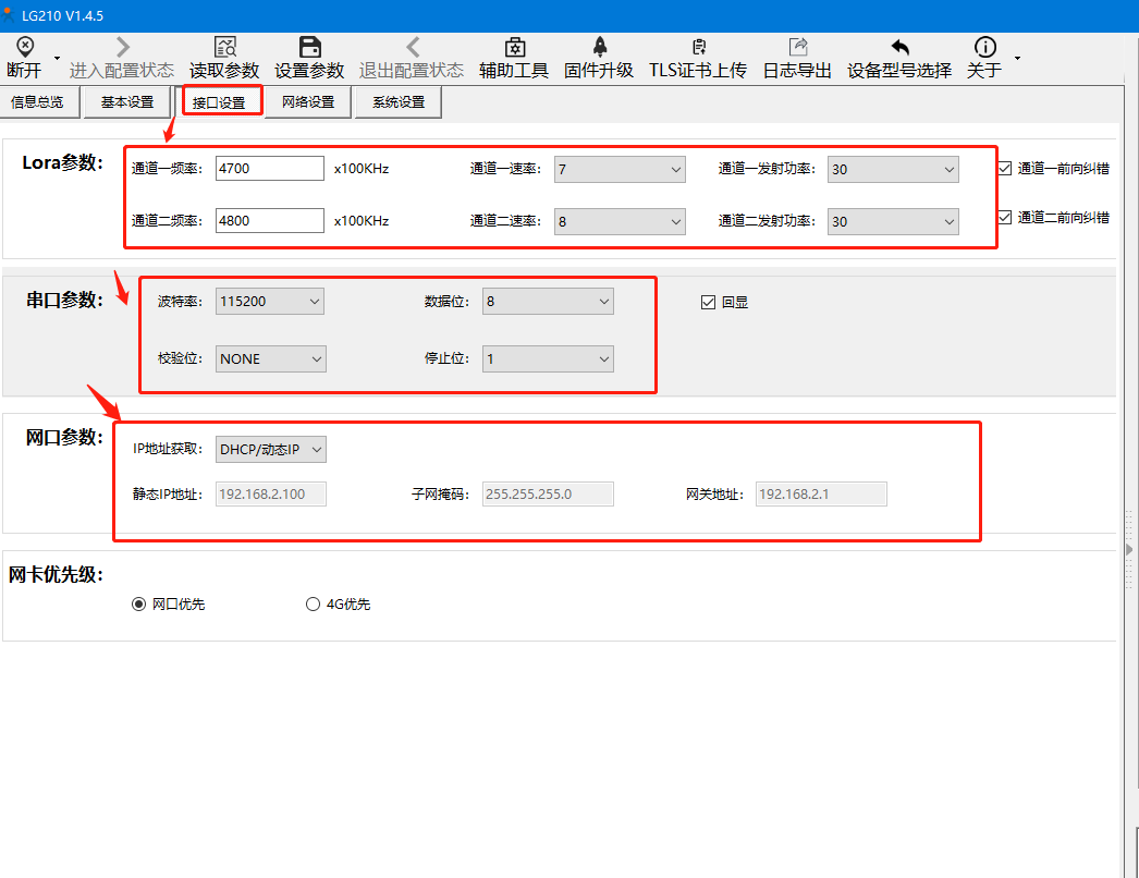 網口參數LG210默認為DHCP自動獲取ip,若需要LG210做靜態ip的話,可以自行修改,本次測試為自動獲取獲取ip。