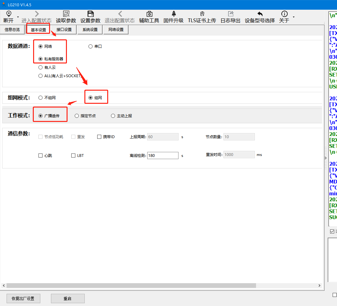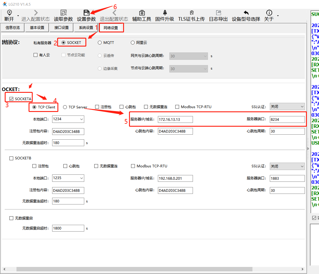 服務器IP/配置為服務器電腦的IP,服務器端口配置為服務器的端口號8234,點擊“設置參數”,點擊重啟設備,待設備重啟,服務器可以監聽到該LG210連接。