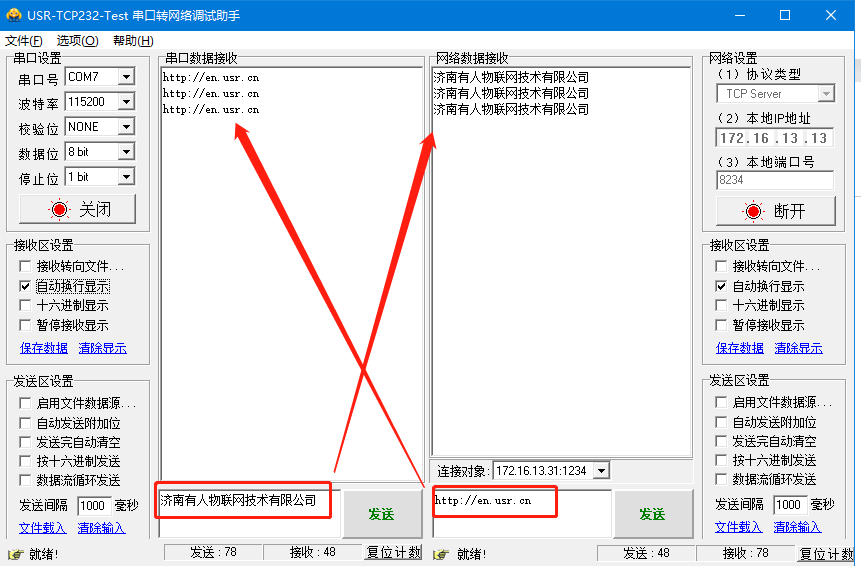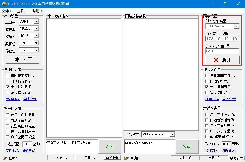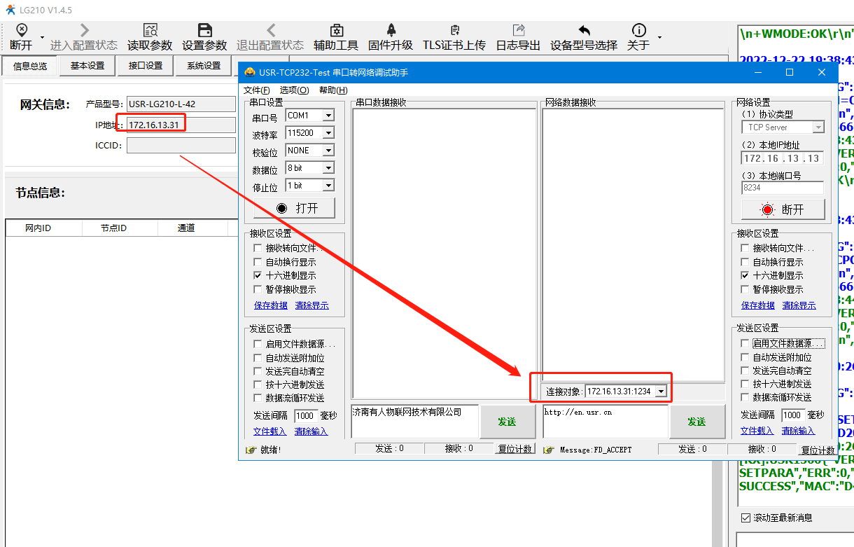 在USR-TCP232-Test軟件,的串口端打開LG206的串口, 可測試通信。