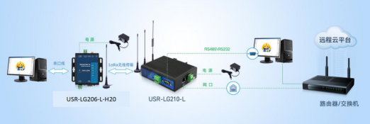 LG210與lora節點(LG206-L-H20)安裝天線,使用各自配套電源適配器供電,LG206串口連接電腦,LG210網口連接路由器或者交換機,電腦也接入該路由器或交換機。