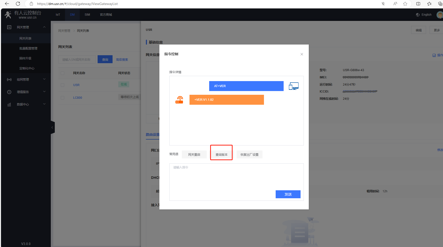 也可以在指令控制彈框,發(fā)送AT+VER,去查詢固件版本號(hào)。