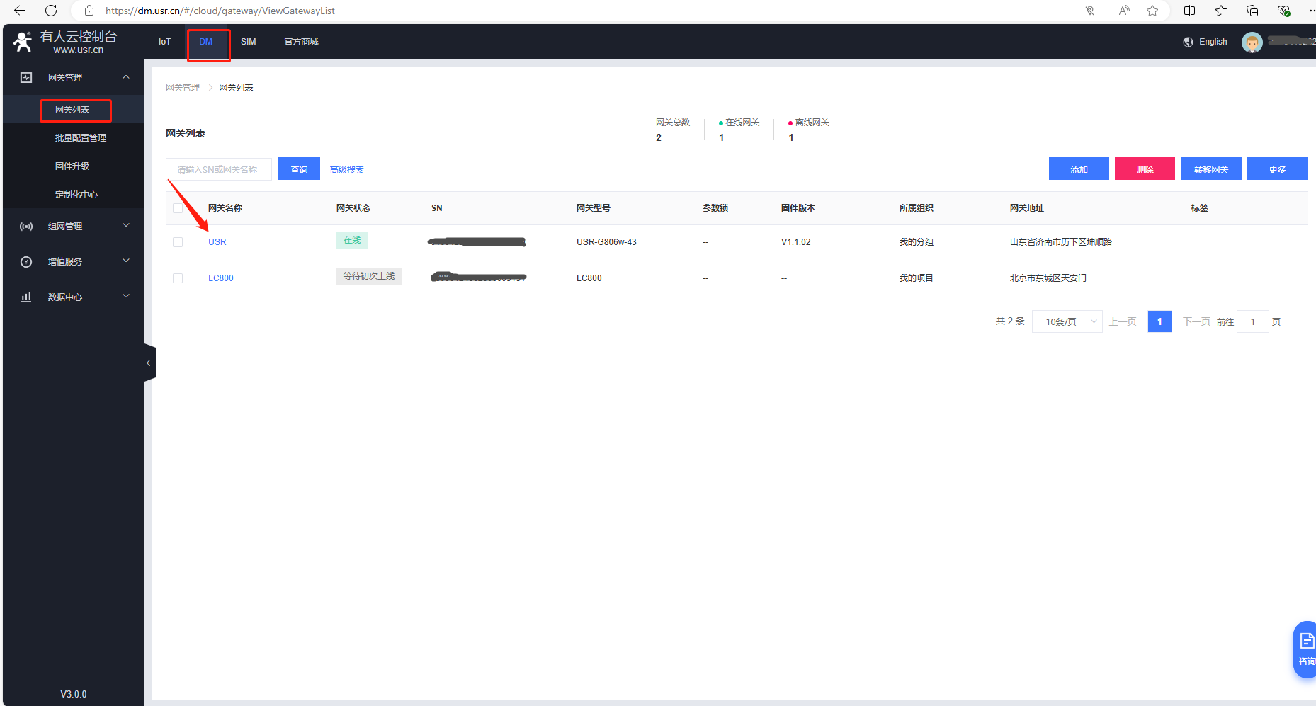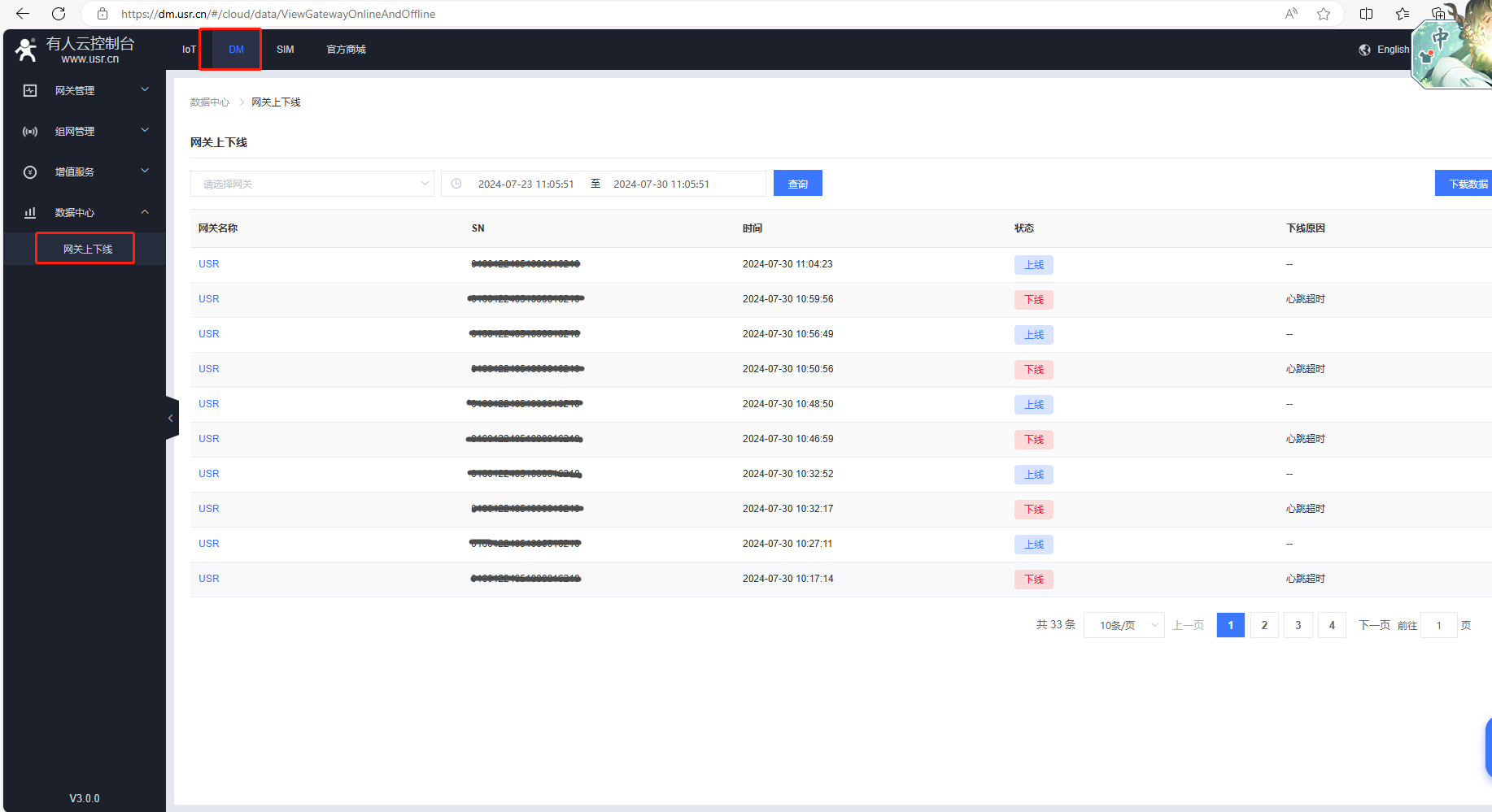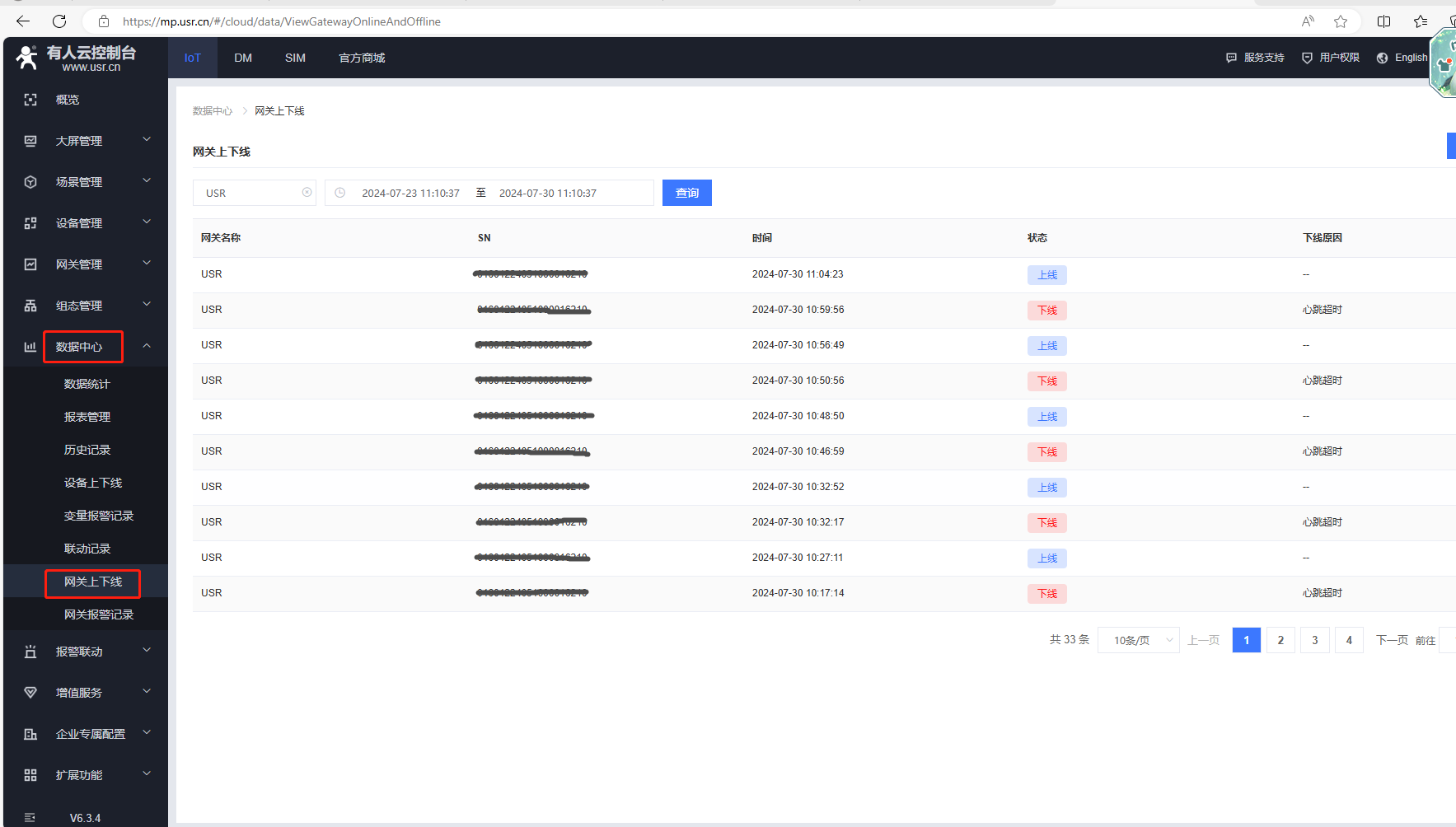 (1)DM平臺(tái),點(diǎn)擊數(shù)據(jù)中心,點(diǎn)擊網(wǎng)關(guān)上下線可以查看網(wǎng)關(guān)的上下線記錄。