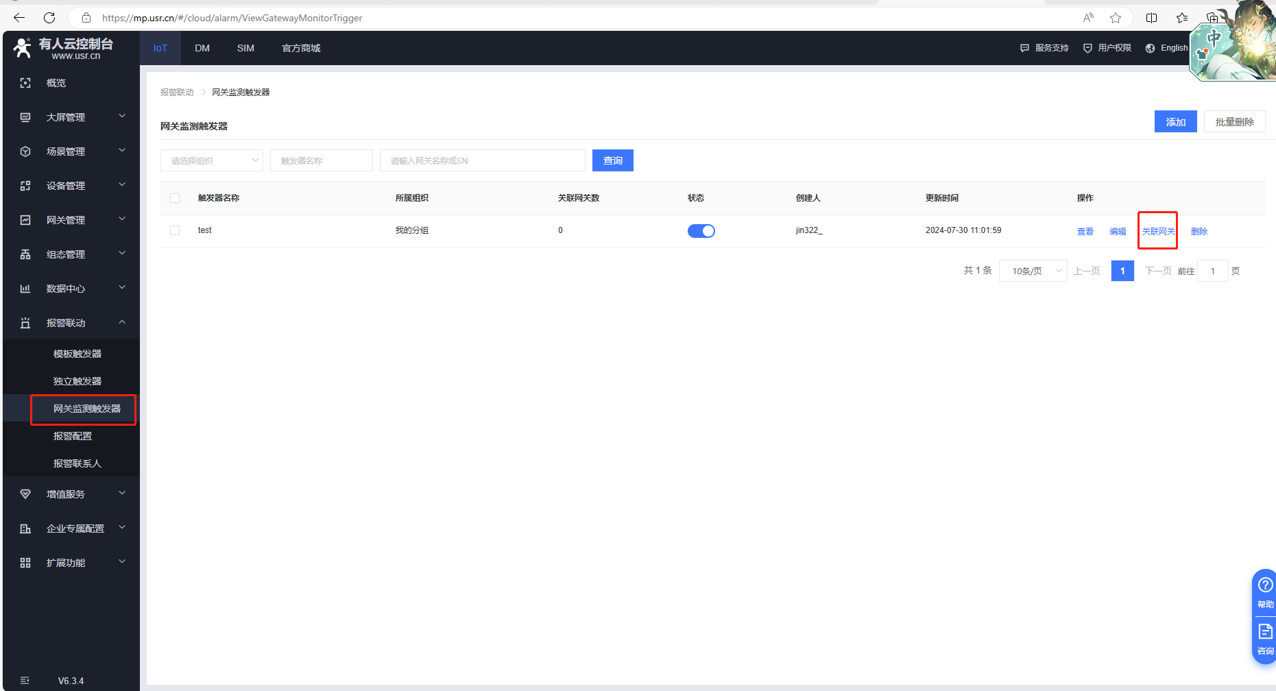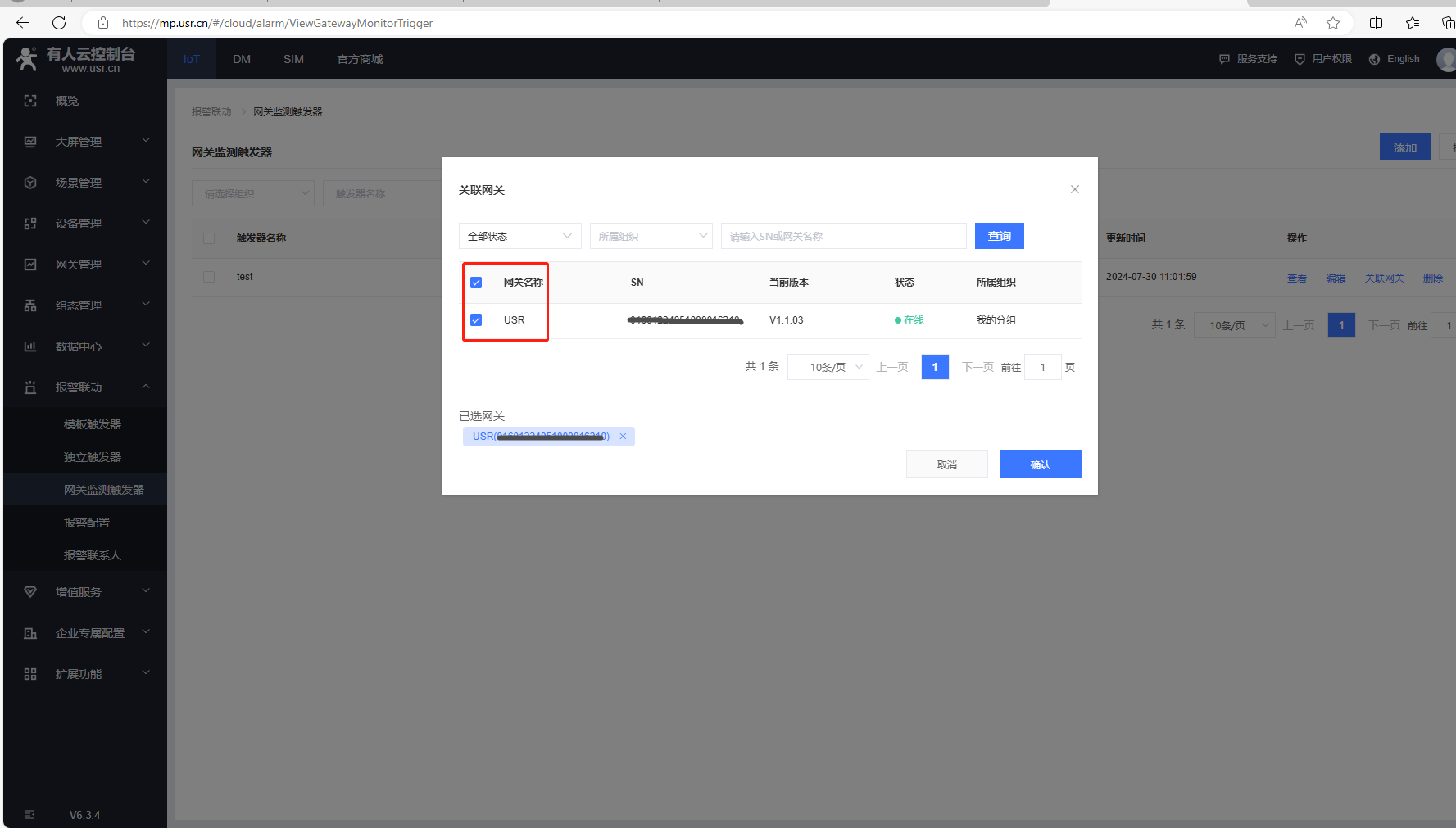 (2)IOT平臺(tái),點(diǎn)擊報(bào)警聯(lián)動(dòng),點(diǎn)擊網(wǎng)關(guān)監(jiān)測(cè)觸發(fā)器,點(diǎn)擊關(guān)聯(lián)網(wǎng)關(guān)。勾選路由器網(wǎng)關(guān),點(diǎn)擊確認(rèn)。