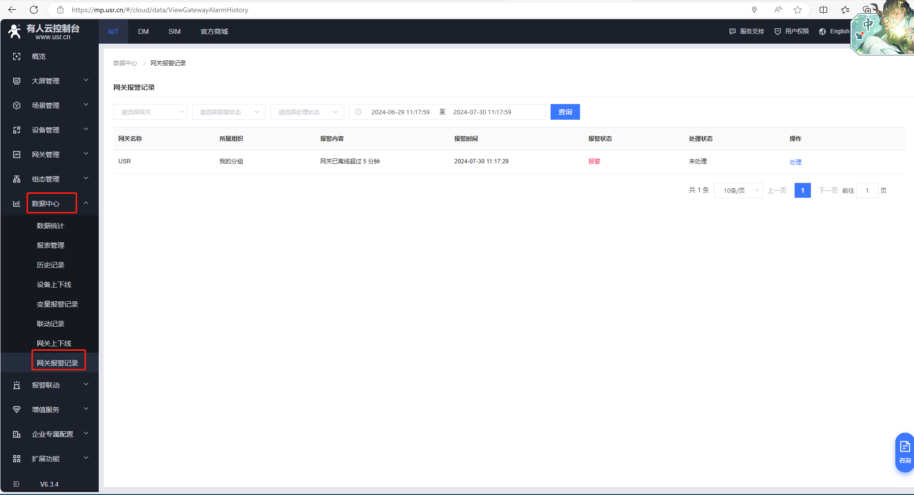 (4)IOT平臺(tái),點(diǎn)擊數(shù)據(jù)中心,點(diǎn)擊網(wǎng)關(guān)報(bào)警記錄,可以查看網(wǎng)關(guān)報(bào)警記錄,報(bào)警狀態(tài)和處理狀態(tài)。