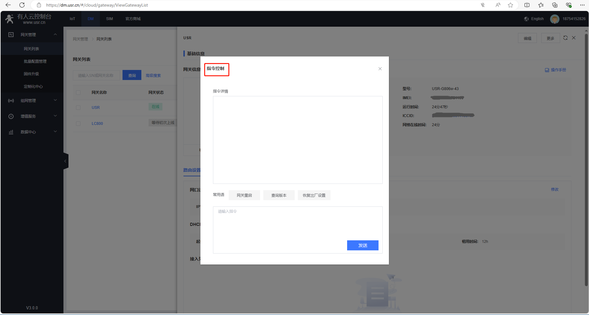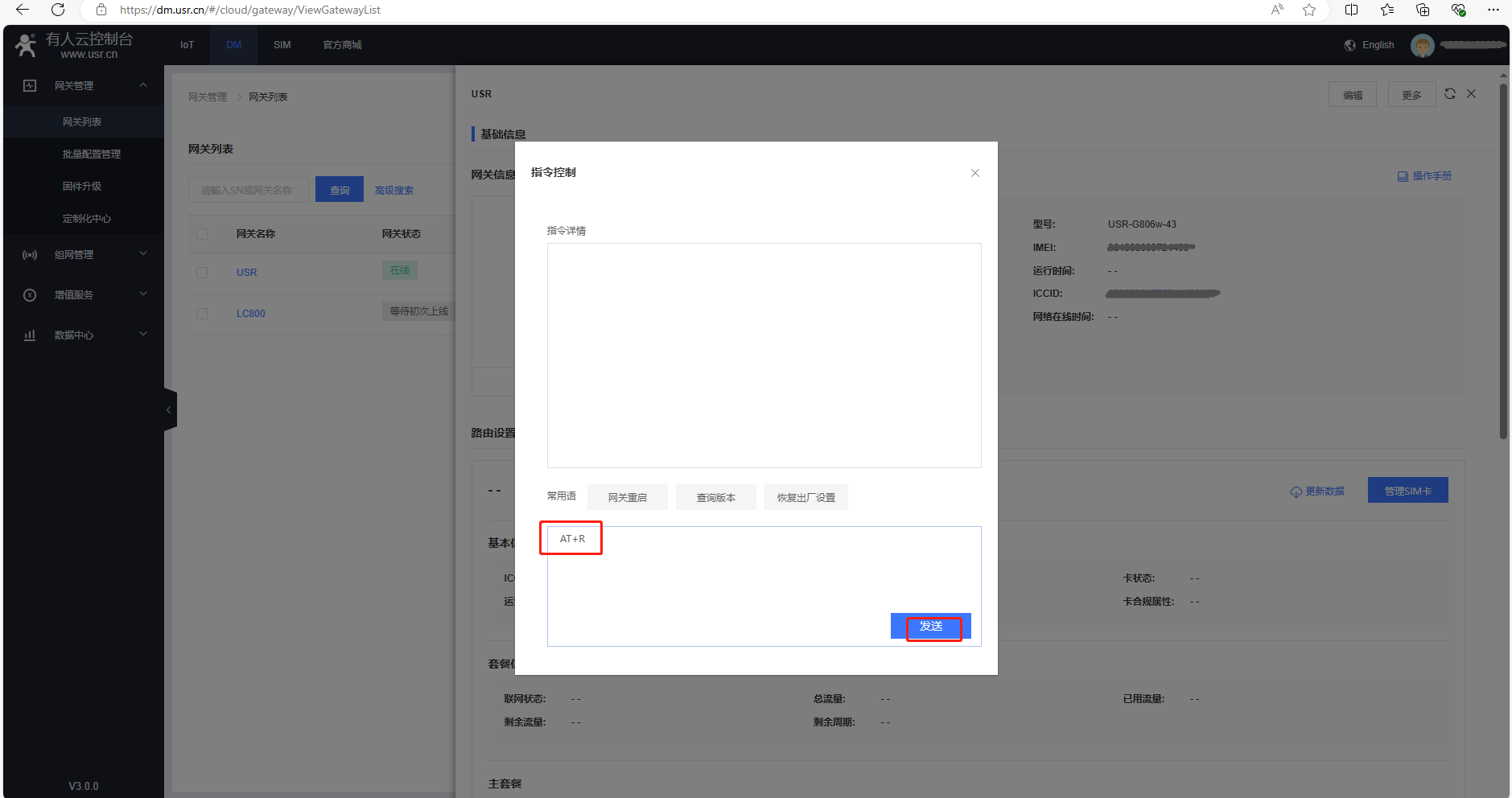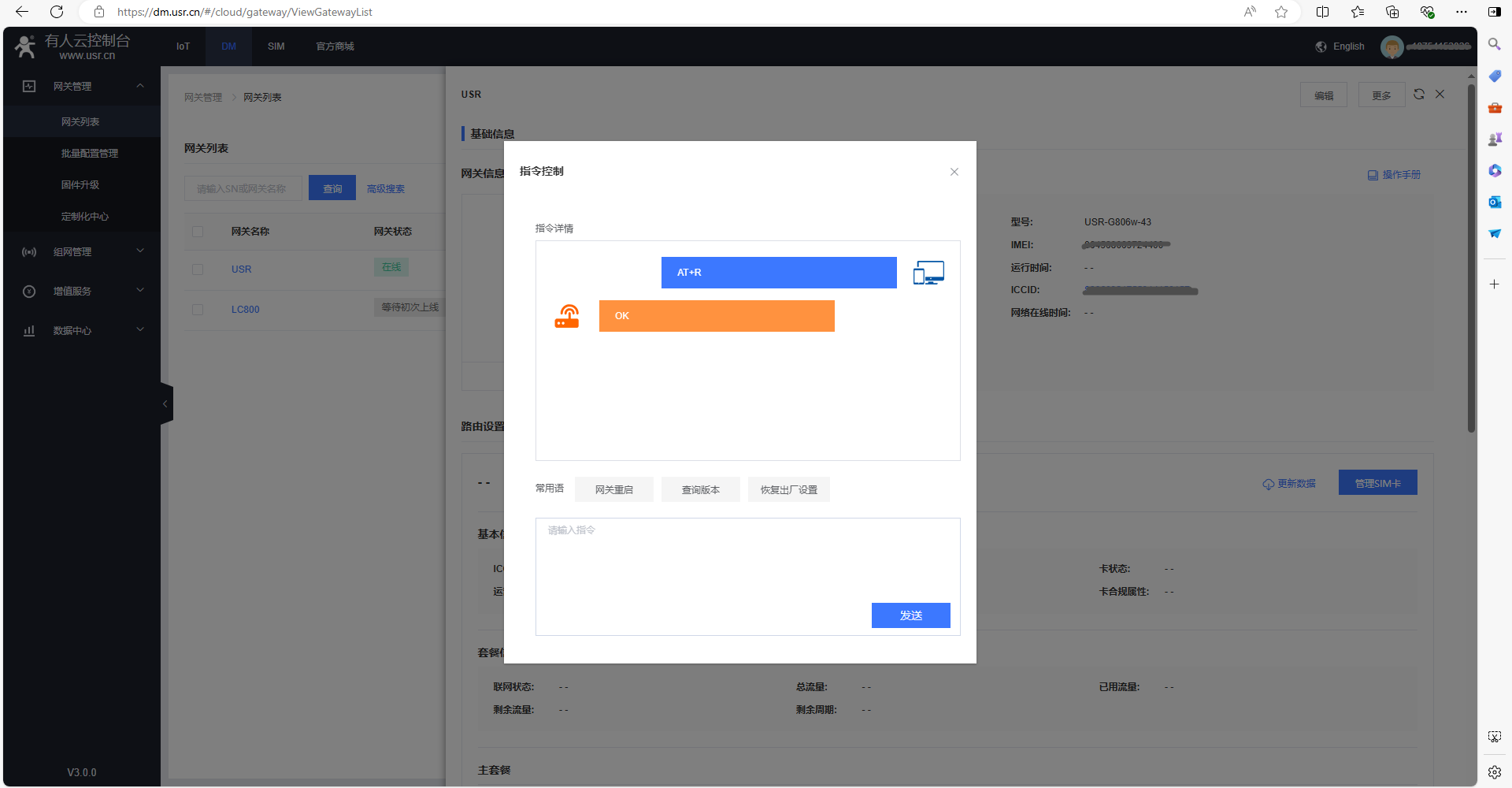 (1)在指令控制彈框,發(fā)送AT+R重啟USR-G806w的AT指令,網(wǎng)關(guān)重啟。