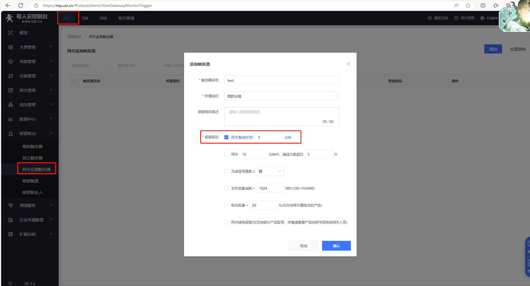(1)IOT平臺(tái),點(diǎn)擊報(bào)警聯(lián)動(dòng),點(diǎn)擊網(wǎng)關(guān)監(jiān)測(cè)觸發(fā)器,點(diǎn)擊添加,按照實(shí)際需要,設(shè)置報(bào)警規(guī)則,舉例,這里設(shè)置的是網(wǎng)關(guān)離線時(shí)間大于5分鐘,報(bào)警。