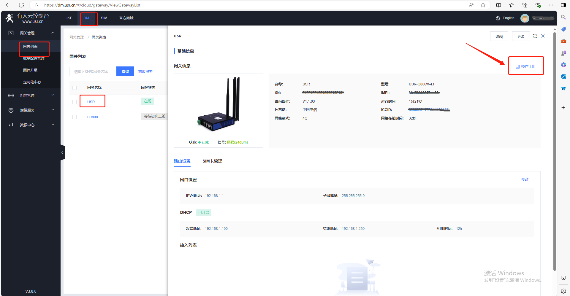 DM平臺(tái),點(diǎn)擊網(wǎng)關(guān)管理,點(diǎn)擊網(wǎng)關(guān)列表,點(diǎn)擊網(wǎng)關(guān)名稱,在展示的信息,可以點(diǎn)擊操作手冊(cè),跳轉(zhuǎn)到路由器的說明書。