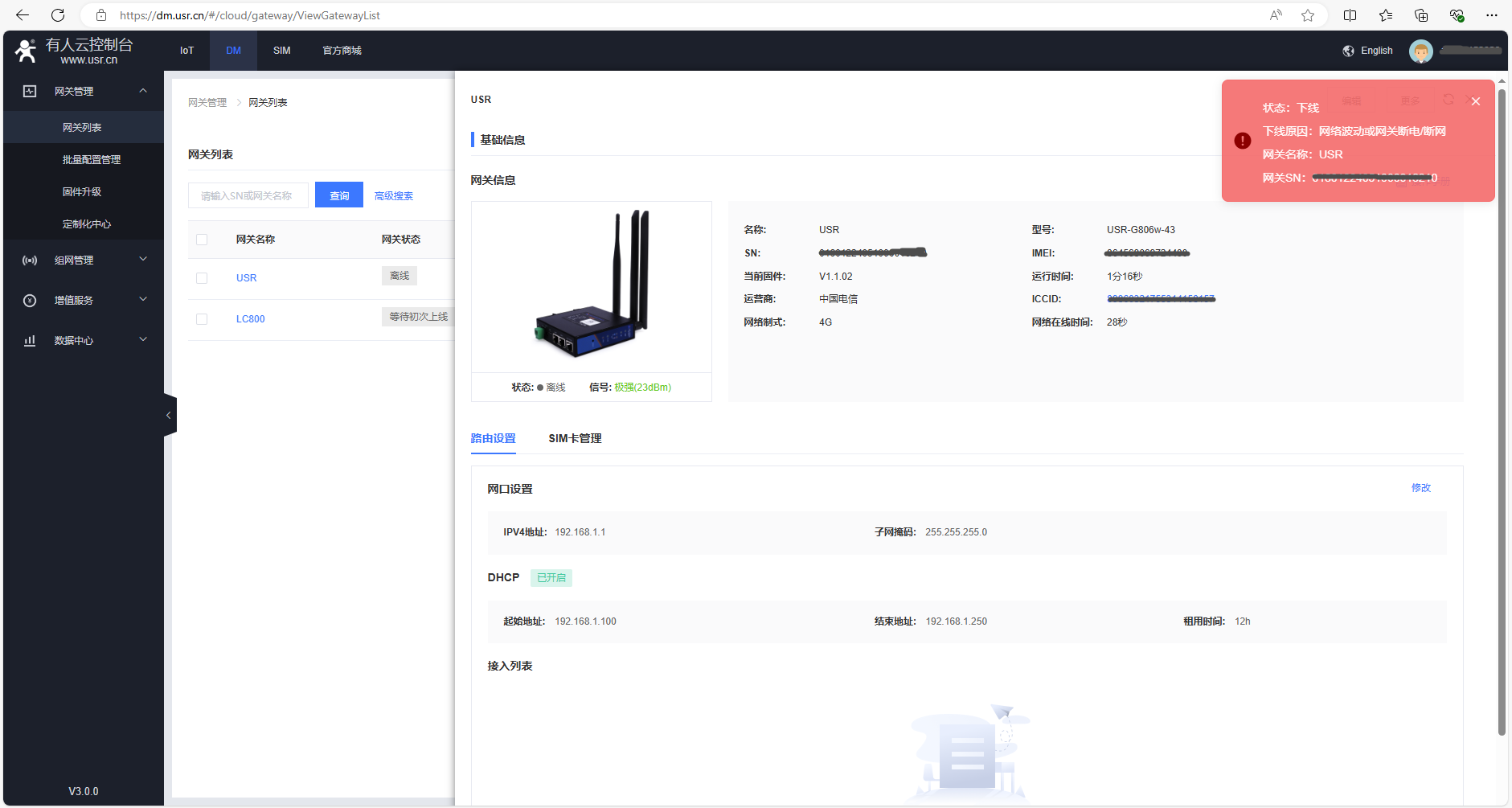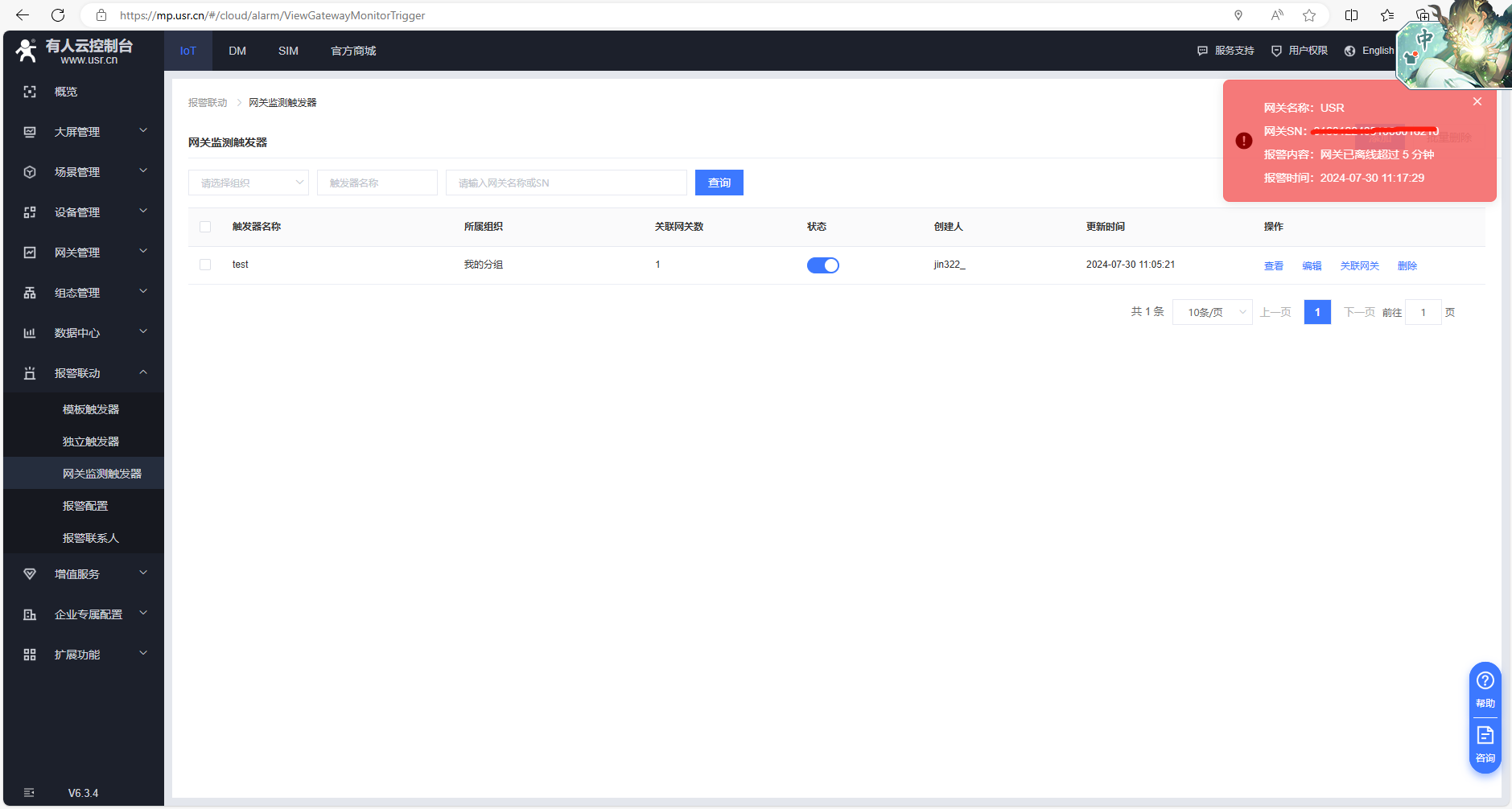 (3)將路由器斷電,會(huì)從有人云離線,等離線時(shí)間大于5分鐘,用人云收到一條報(bào)警信息,網(wǎng)關(guān)已離線超5分鐘。
