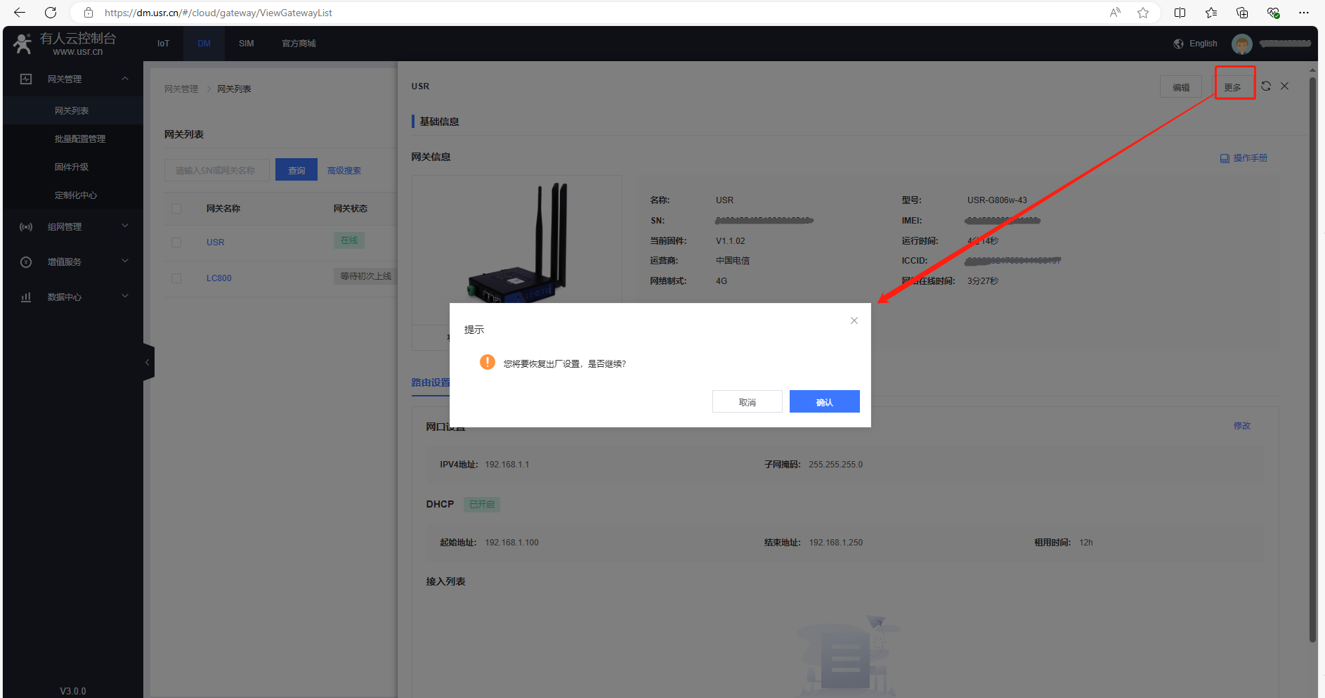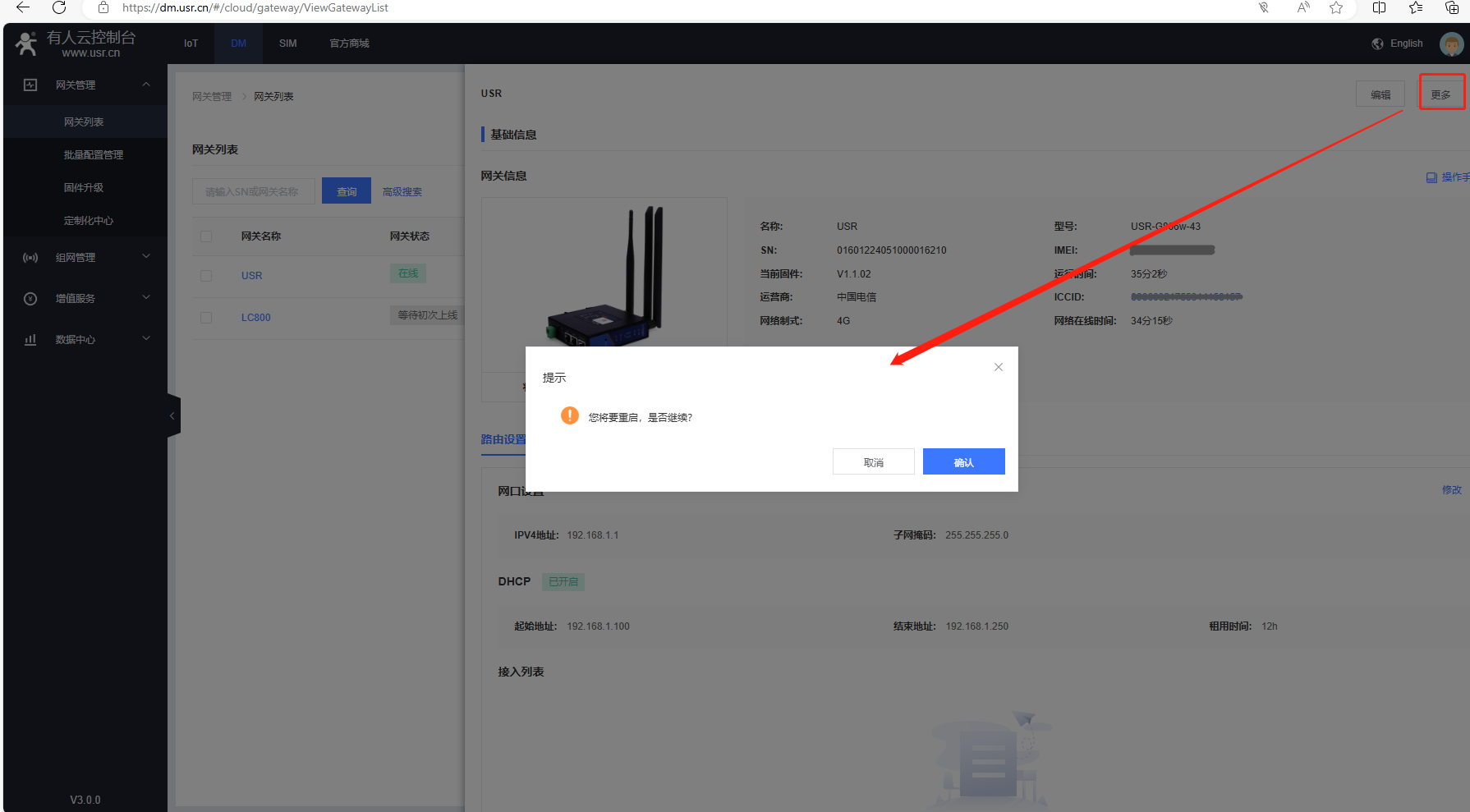 6、DM平臺(tái),點(diǎn)擊更多,重啟網(wǎng)關(guān)