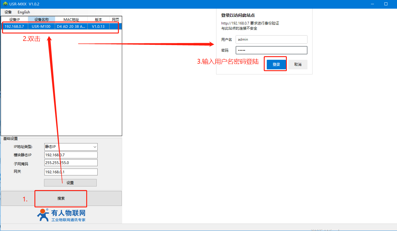 2>參數(shù)設(shè)置:打開設(shè)置軟件;如果電腦和M100的IP不在同一個網(wǎng)段,軟件會有下圖的提示,在電腦上臨時生成一個192.168.0.xx網(wǎng)關(guān)的IP地址,才能來配置USR-M100的參數(shù)