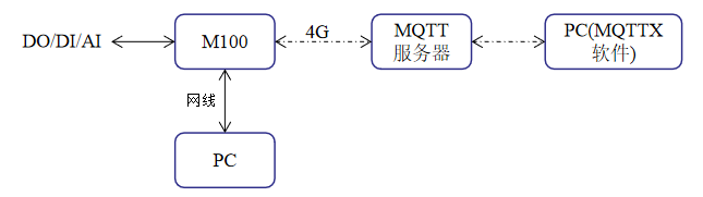 1>硬件鏈接:M100的網(wǎng)口和電腦直連,或者通過路由器將M100和電腦組成一個局域網(wǎng);裝上4G天線;M100的485串口通過USB轉(zhuǎn)485接到PC上;上電