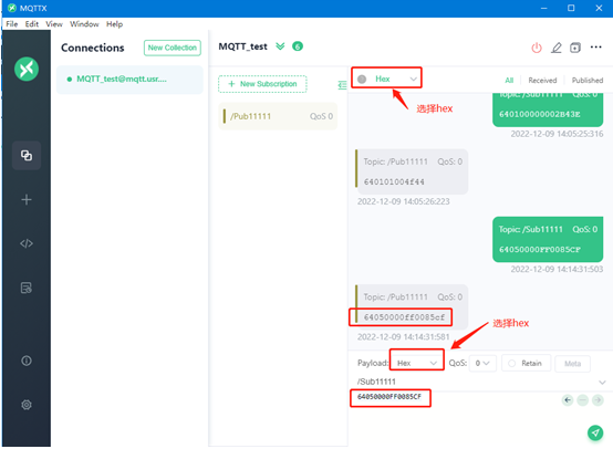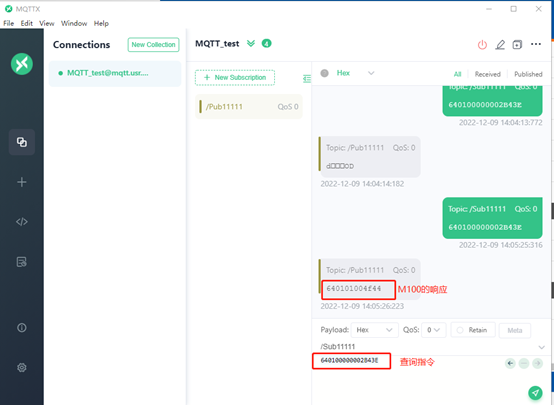 3>通過MQTTX發(fā)送指令查詢/控制M100的DO口狀態(tài):注意指令均是modbus的,需要以hex格式發(fā)送以及顯示數(shù)據(jù)