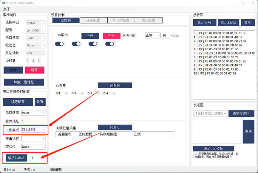 4. LH-IO404通過USB轉(zhuǎn)485轉(zhuǎn)換器接到電腦上,打開LH-IO404的上位機,測試繼電器是否能正常控制,并將繼電器的工作模式設(shè)置成雙機非鎖模式,設(shè)備地址默認為1 ,4臺LH-IO404均為此設(shè)置。給LH-IO404標號為LH-IO404-11, LH-IO404-12, LH-IO404-13, LH-IO404-2
