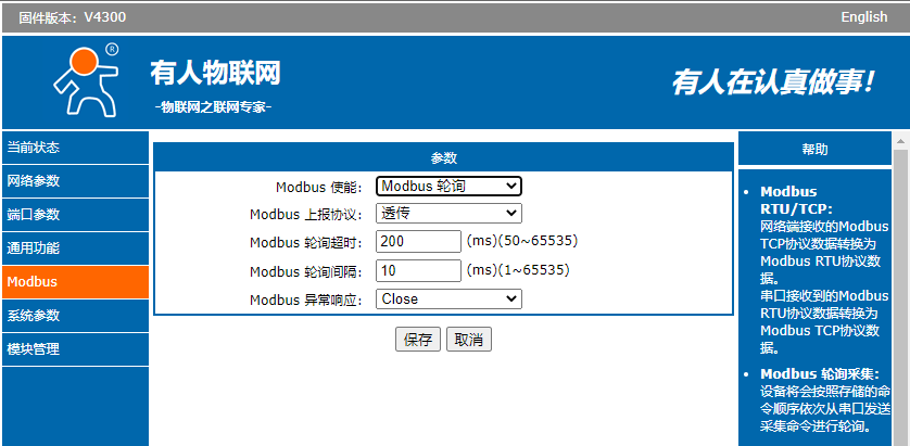 Modbus參數(shù)設(shè)置:設(shè)置為modbusTCP/RTU ,上報協(xié)議:透傳
