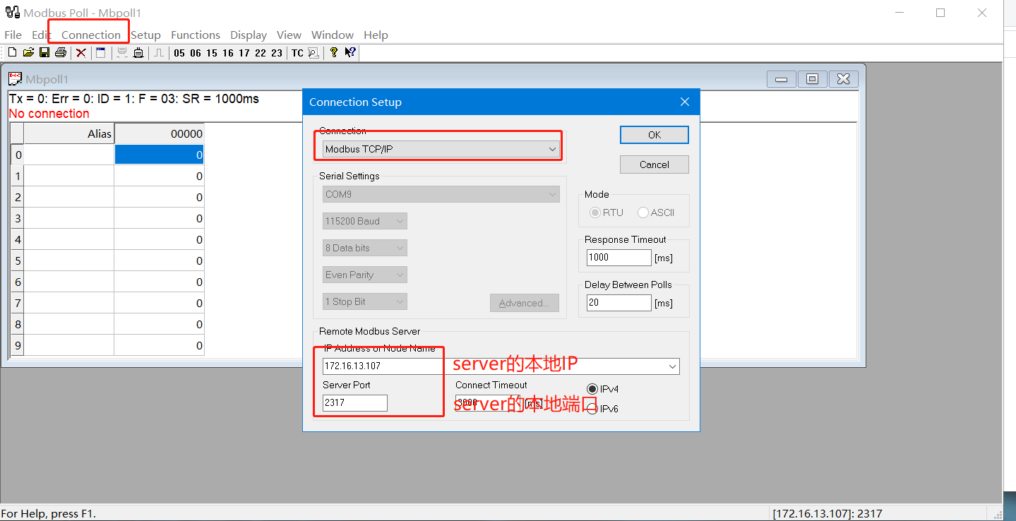 2、ModbusPoll參數(shù)設(shè)置: