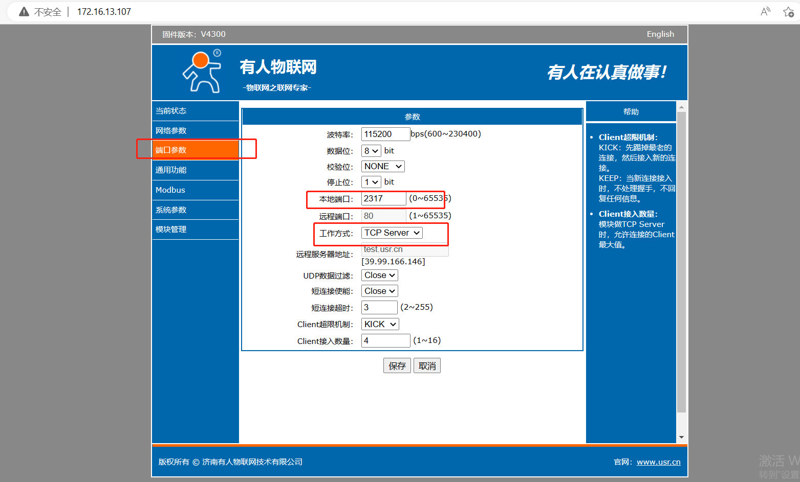 設(shè)置工作方式:TCPserver ,本地端口號:2317(自定義即可)