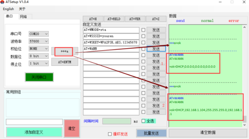 3、發(fā)送AT+Z重啟,點擊進入配置狀態(tài),可以通過AT+WANN查詢路由器給設(shè)備分配的ip地址。
