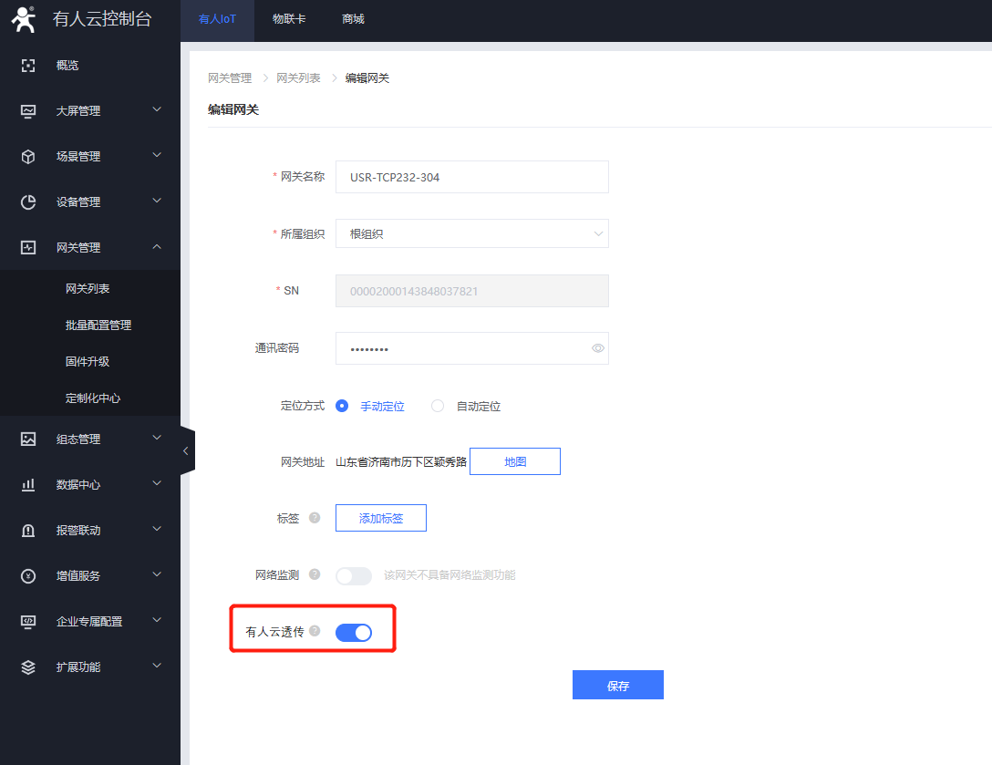 云平臺(tái)添加設(shè)備,在網(wǎng)關(guān)管理---網(wǎng)關(guān)列表--添加網(wǎng)關(guān),點(diǎn)擊SN不支持,系統(tǒng)自動(dòng)生成,不需要自己設(shè)置,打開(kāi)數(shù)據(jù)透?jìng)鏖_(kāi)關(guān),通訊密碼可以自定義8位密碼.(建議使用系統(tǒng)自動(dòng)生成的通訊密碼)