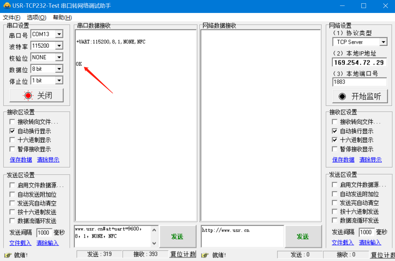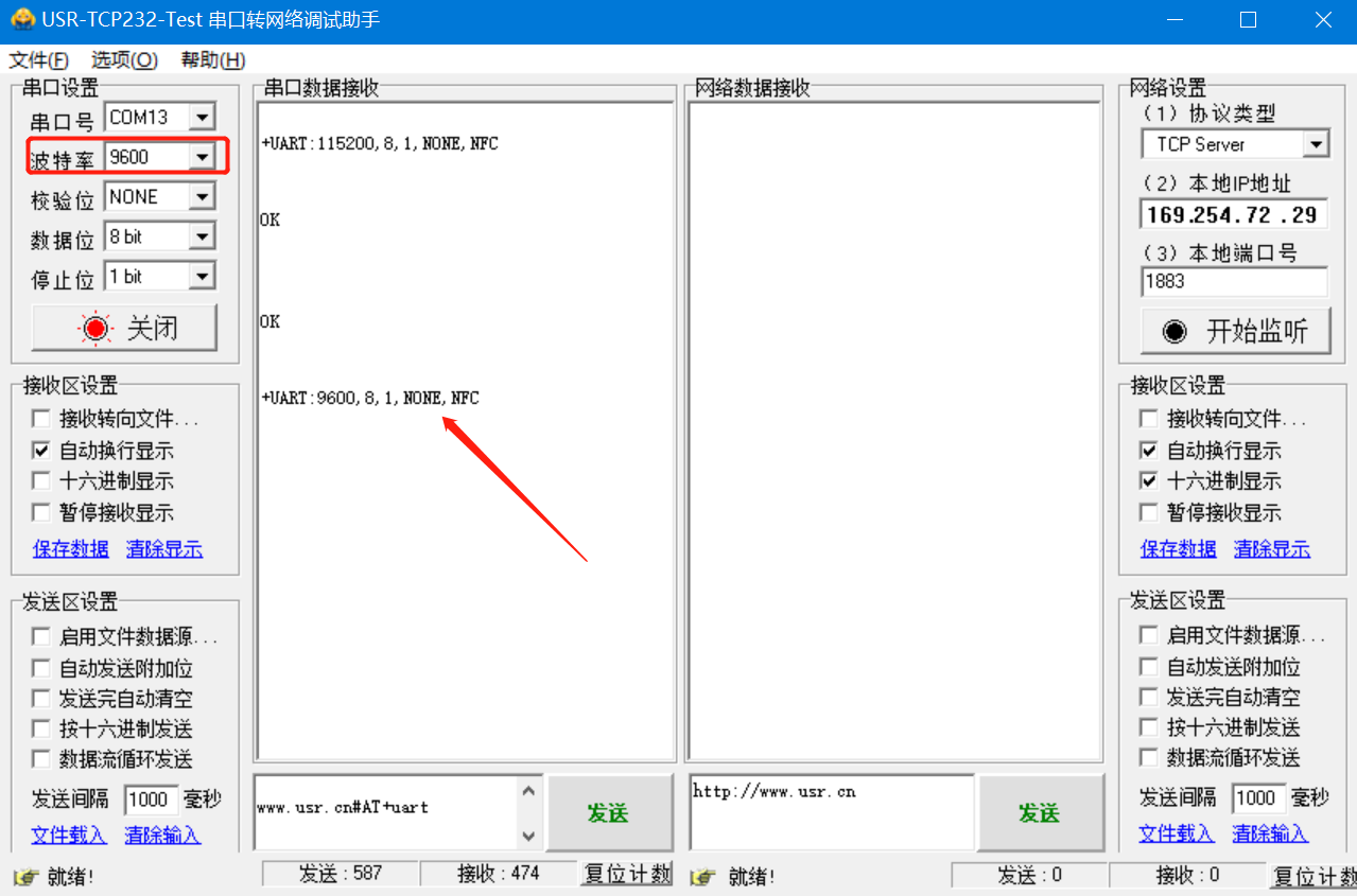 1.使用修改串口參數指令修改波特率為9600