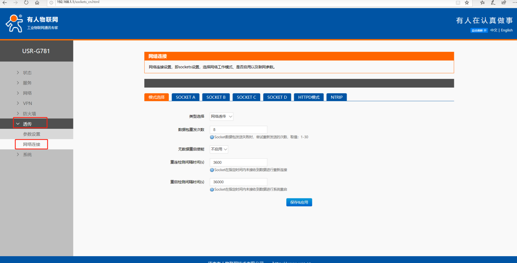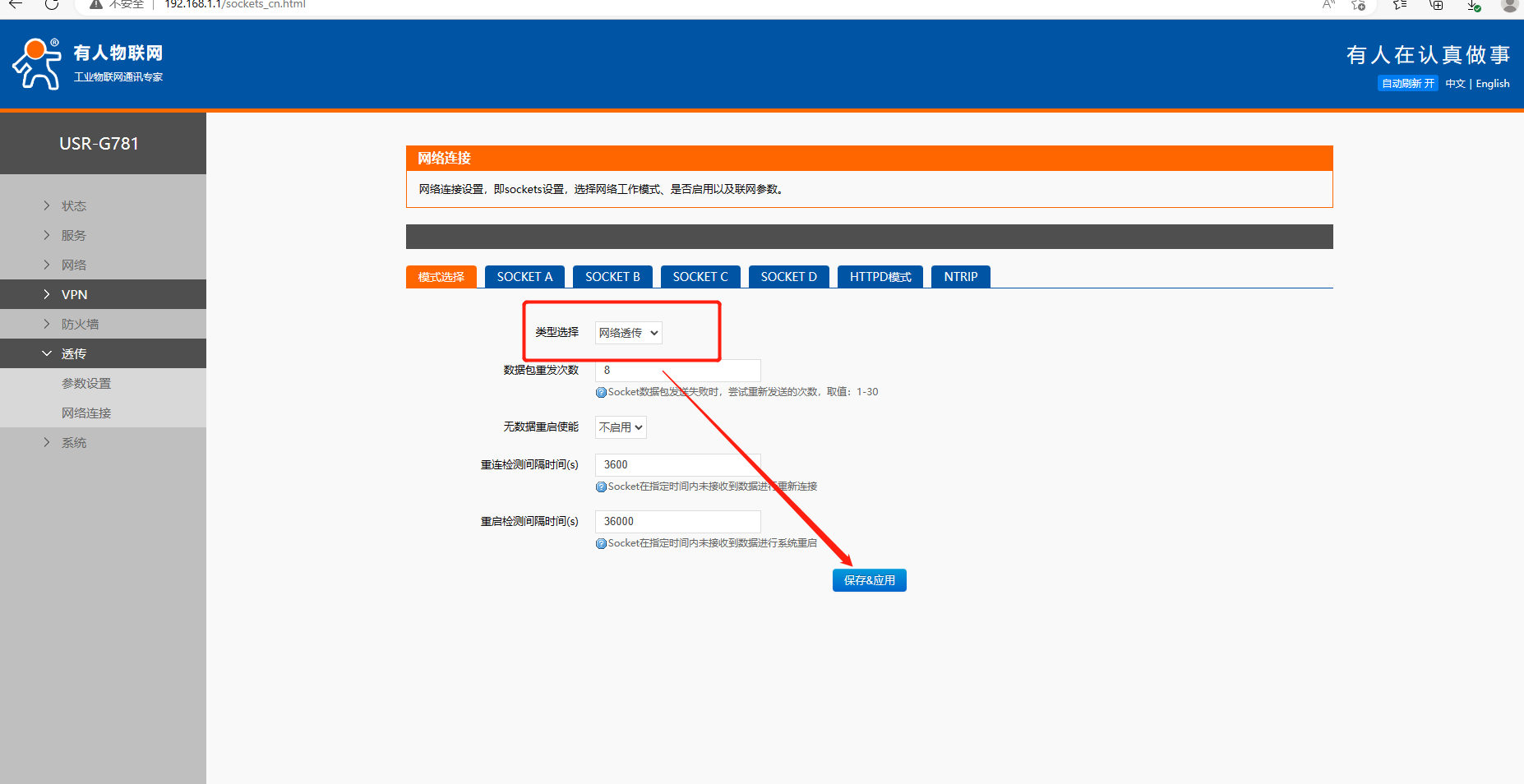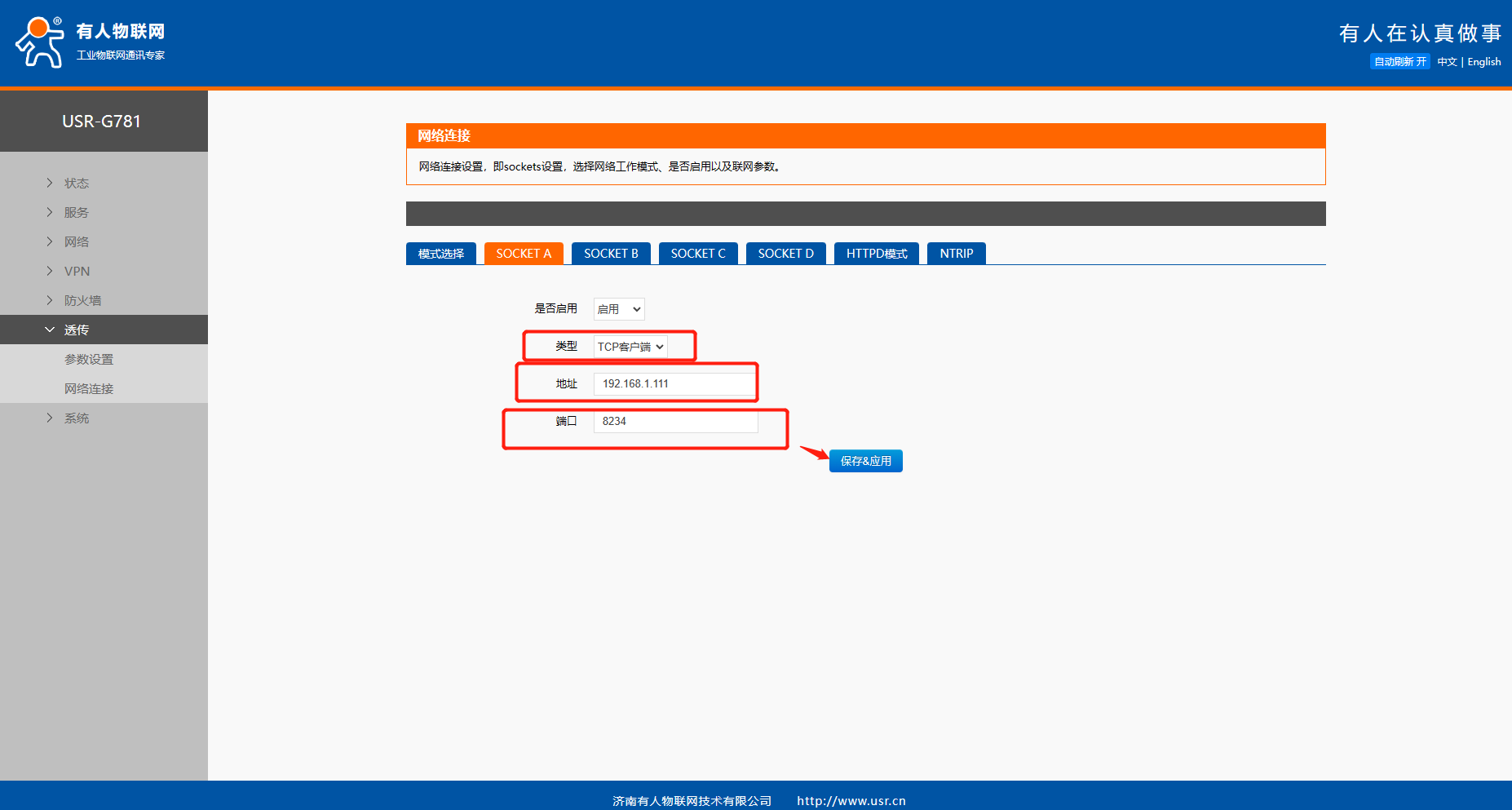 選擇SOCKETA,啟用,類型設置為tcp客戶端,打開虛擬串口軟件設置為tcp sever模式,在g781內置網頁設置上虛擬串口的ip和虛擬串口的本地端口號,保存并應用