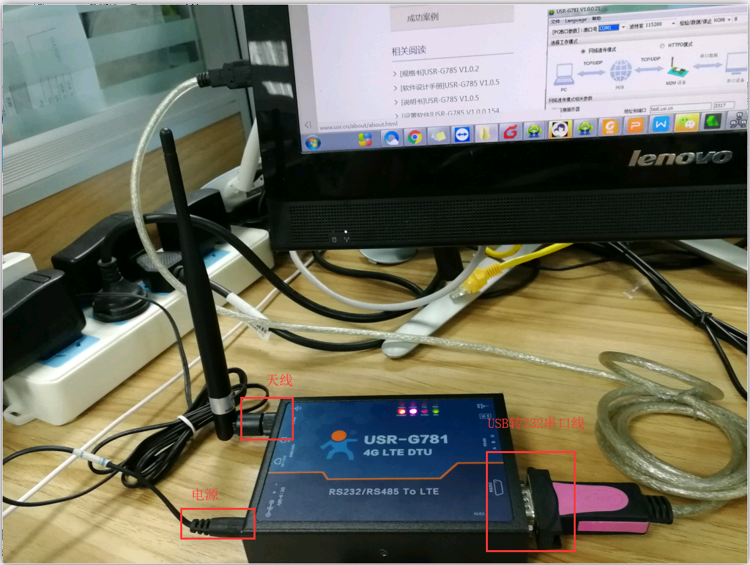 一、781串口通過USB轉232/485接到電腦端,使用12v電源適配器上電。(如不需訪問外網sim卡和天線可不裝)