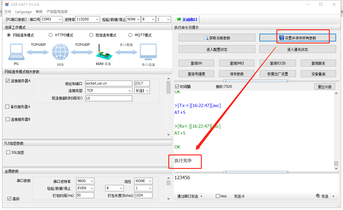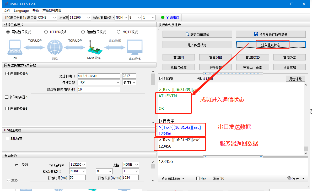 通過串口發送<123456>,可以看到服務器返回了相同的內容,說明DTU工作是沒有問題的。
