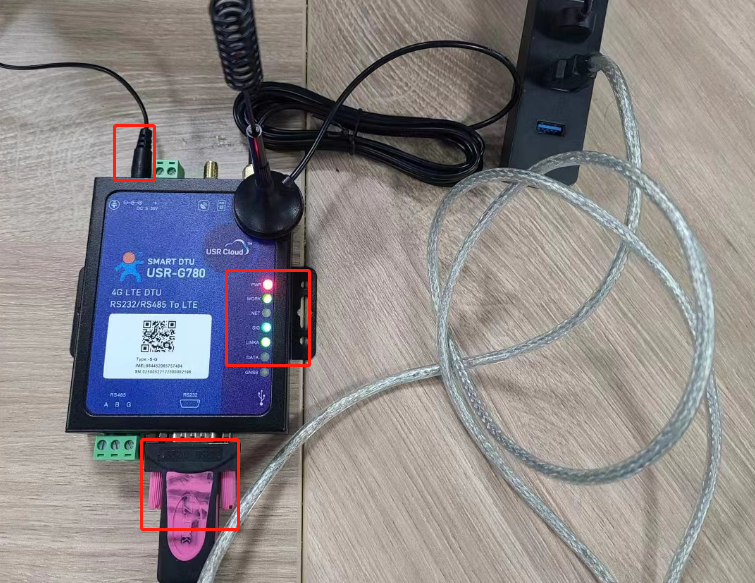 可以用內置sim卡,也可以外插卡(測試是用的內置sim卡),用232或者485轉usb線把780s的串口接到pc上,用我司電源適配器供電