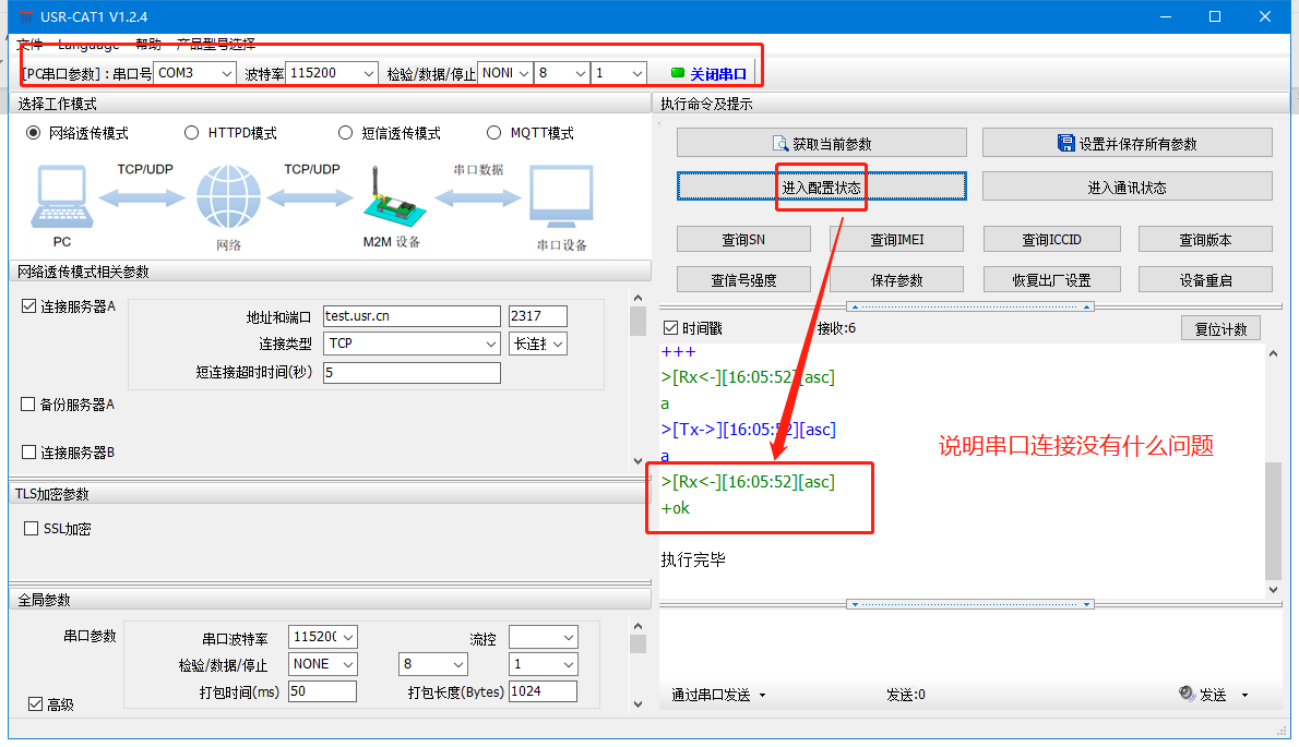 3.打開串口后,先點擊進入配置狀態,如果模塊能返回+ok的字符,說明電腦和模塊連接是沒有問題的;然后點擊進入通訊狀態,做數據通訊測試。如果不返回+OK的話,請參考注意里的事項。