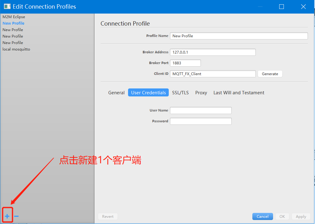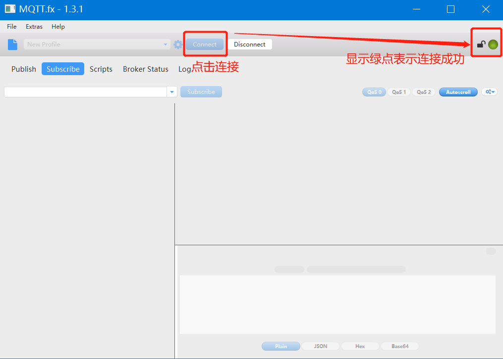 5.打開MQTT Client 軟件:MQTT.FX,點(diǎn)擊左下角新建1個客戶端,填寫好MQTT服務(wù)器的參數(shù)后,點(diǎn)擊“Connect”,右側(cè)出現(xiàn)綠點(diǎn)表示連接成功。