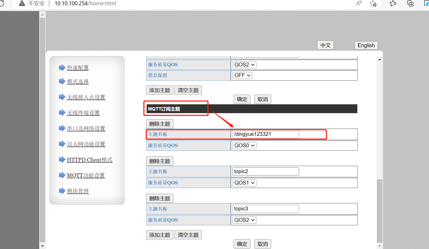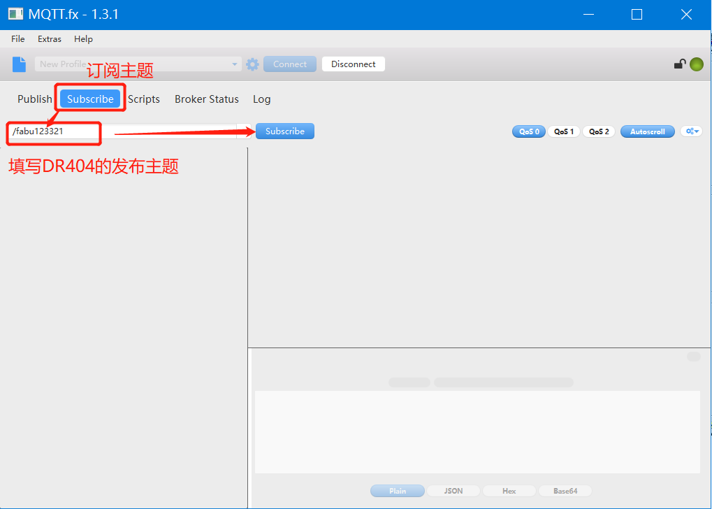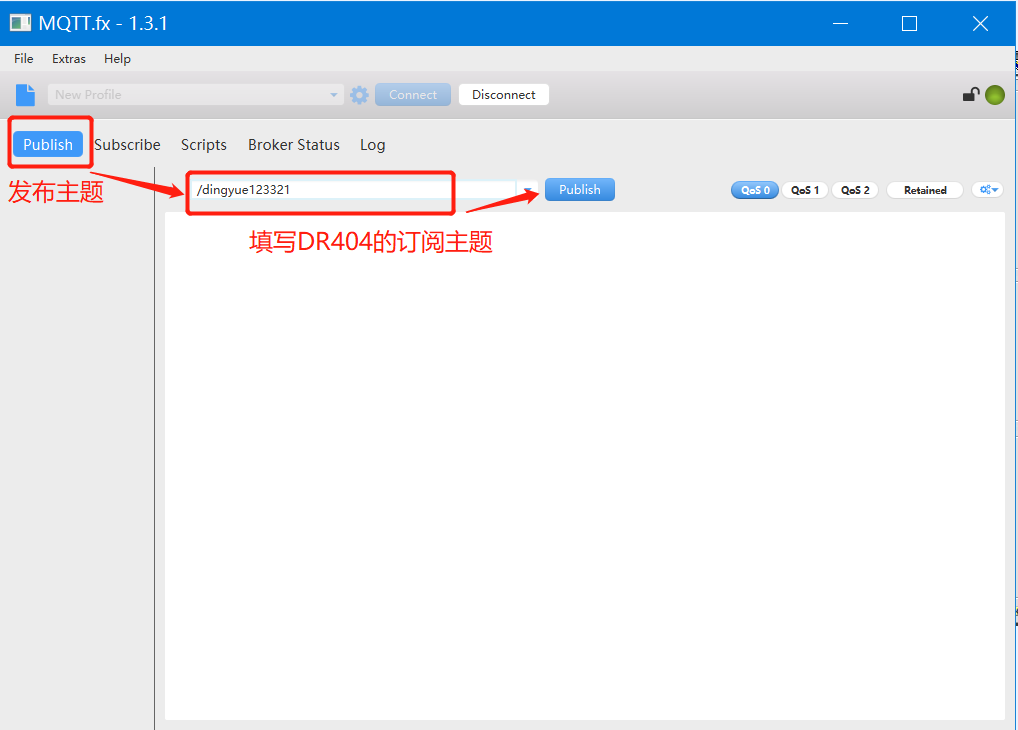 6. MQTT客戶端軟件的“發(fā)布主題”,填寫DR404的訂閱主題;MQTT客戶端軟件的“訂閱主題”,填寫DR404的發(fā)布主題。