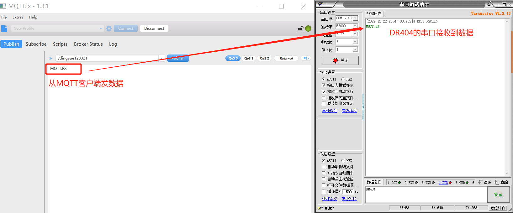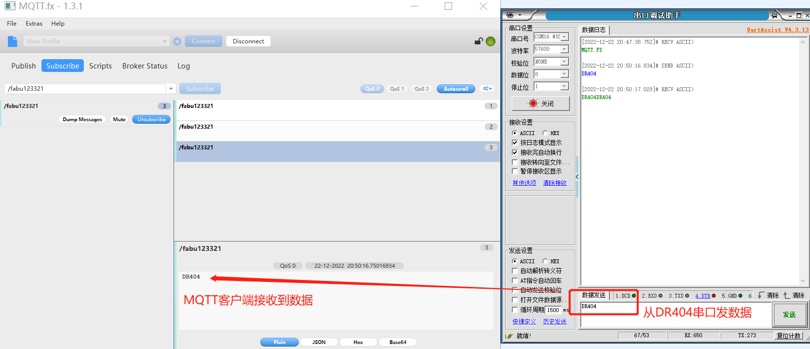 選擇好對應(yīng)的串口參數(shù)后,點(diǎn)擊打開串口,進(jìn)行數(shù)據(jù)測試。可以看到從MQTT客戶端發(fā)數(shù)據(jù),DR404串口端收到數(shù)據(jù);從DR404串口端發(fā)送數(shù)據(jù),MQTT客戶端也可以收到數(shù)據(jù),數(shù)據(jù)通信成功。