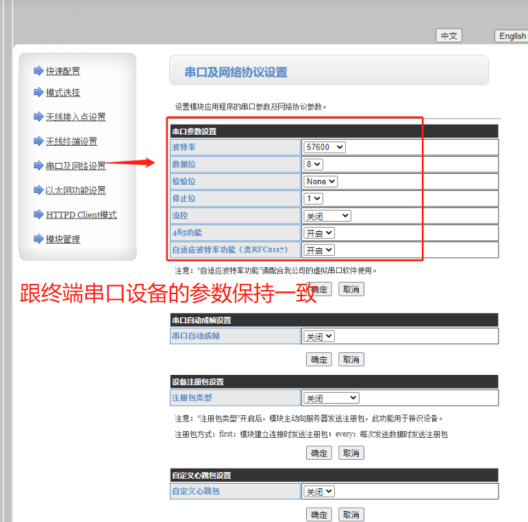 3.打開“串口及網(wǎng)絡(luò)設(shè)置”,修改串口參數(shù),跟終端設(shè)備的參數(shù)保持一致,然后點(diǎn)擊“確定”。